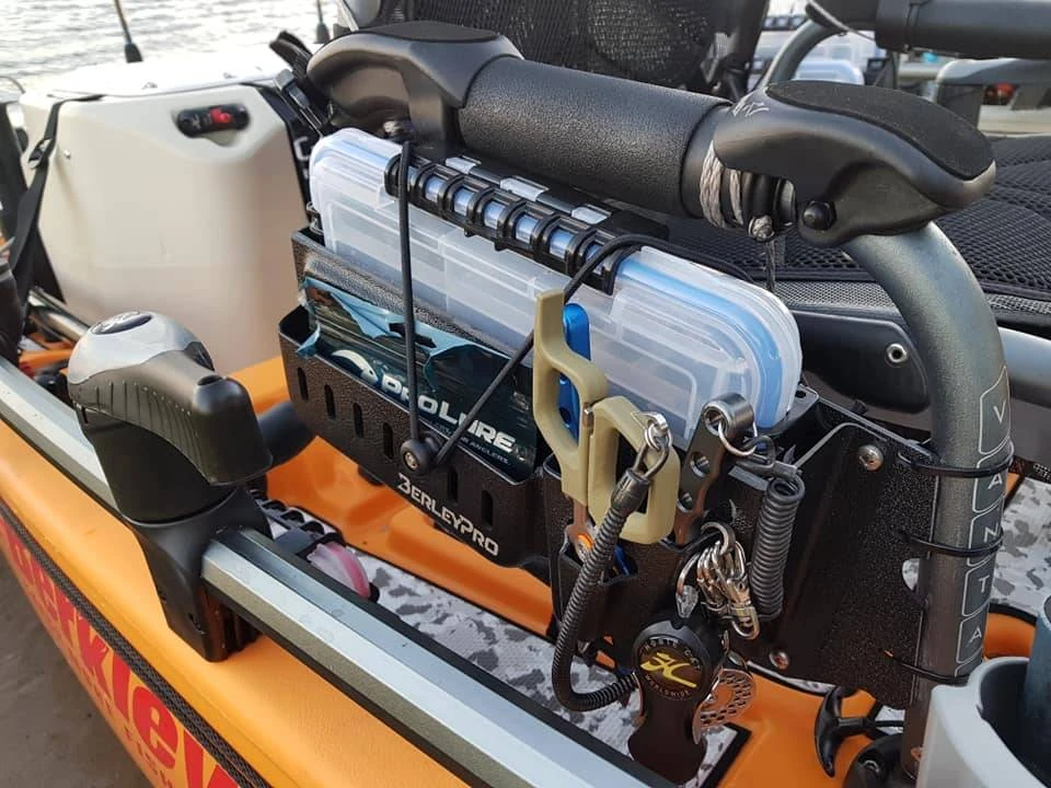 The Prison Pocket is a storage system designed to hold nearly anything. This has a large pocket to hold tackle boxes at the rear (275mm L x 118mm H x 45mm D) and a smaller pocket on the front to hold soft plastic pouches or smaller tackle trays (170mm L x 60mm H x 24mm D). The slots on the front of the small pocket are used for hanging jig heads or lures. The two formed Vs on the side are made for holding pliers, scissors and fish grips. This is formed from ABS plastic and can hold the following. We have a range of adaptors to suit seats, track mounts and much more!